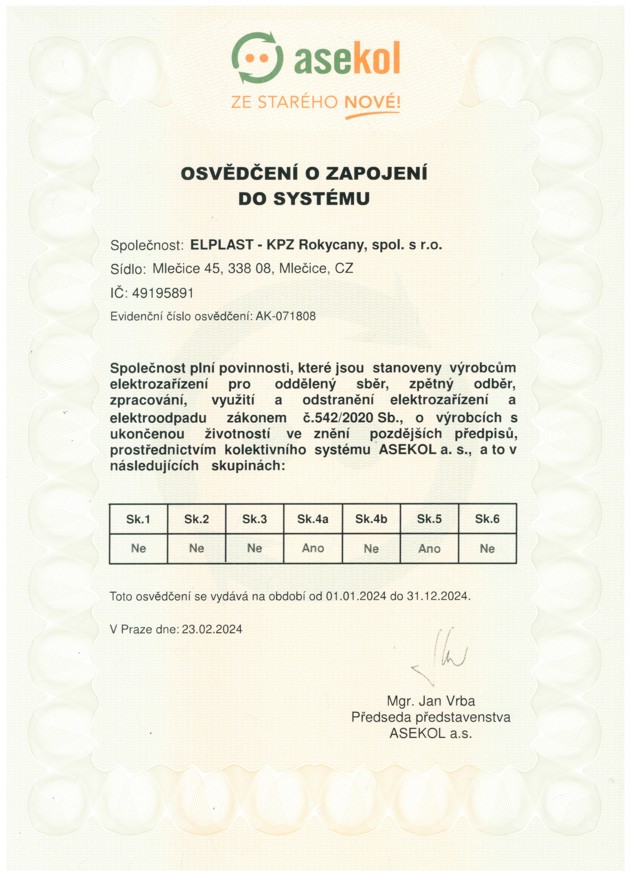 Naše společnost Elplast - KPZ Rokycany, spol. s r. o. je zapojena do kolektivního systému zpětného odběru elektrozařízení ASEKOL. Společnost ASEKOL zajišťuje sběr a ekologické zpracování vysloužilého elektrozařízení. Také garantuje kvalitu ekologického nakládání s elektroodpadem.